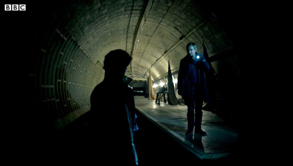 Dans cet épisode au titre prometteur de The Empty Hearse (Le corbillard vide), Sherlock et la médecin-légiste Molly Brown (remplaçant temporairement Watson) sont contactés par un employé de la District Line chargé de visionner les bandes de vidéo surveillance. Ils découvrent en arrivant à son domicile un imposant module reproduisant une station du London Underground (à gauche de l’image) :