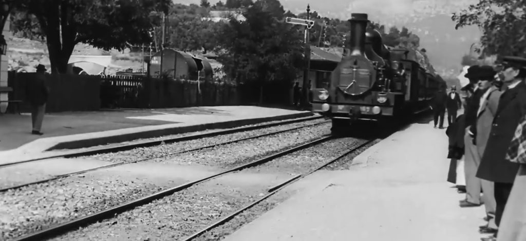 - A 100m de là, 14 boulevard des Capucines, dans le Salon Indien du Grand Café (actuel restaurant « 1895 », ex-« Jardin des Muses », de l’Hôtel Scribe) eut lieu le 28 décembre la première projection du Cinématographe Lumière. Pendant longtemps j’ai cru que le premier film ferroviaire de l’histoire L’arrivée d’un train en gare de la Ciotat était au programme (que nenni : d’après Wikipedia, il a été projeté pour la première fois à Lyon le 26 janvier 1896 ).